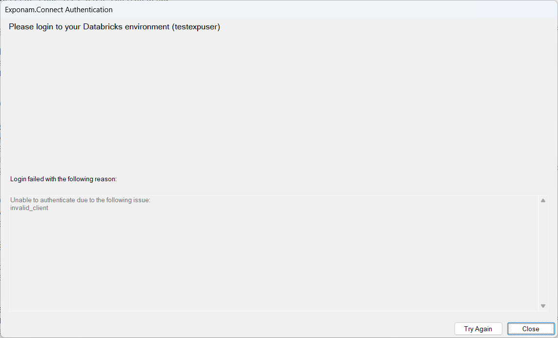 You are attempting to access a data share and after providing your login credentials you receive a message: Login failed with the following reason: Unable to authenticate due to the following issue: invalid_client