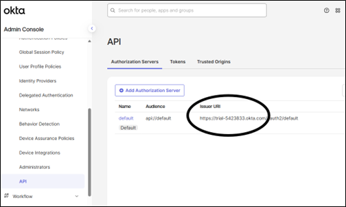 e. Audiences - use the existing default API Authorization Server Audience from your OKTA API Authorization Servers (Navigate Security -> API.) If using the default, the correct value is the beginning portion of the Issuer URI