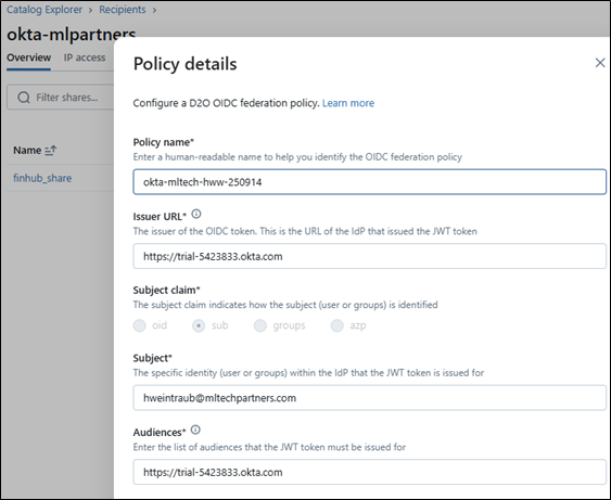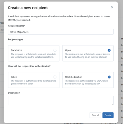 2. Set up a Recipient record in Delta Sharing of Type=Open, OIDC Federation. Make sure you grant Shares for the recipient to access.