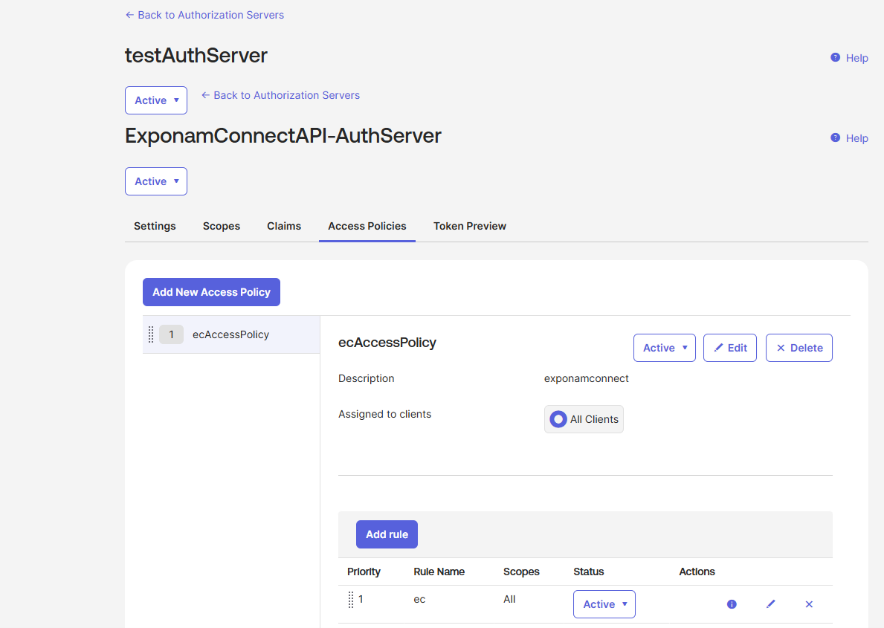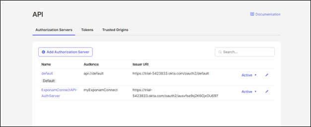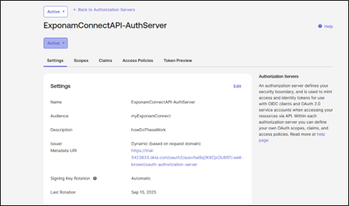 Create a new API Authorization Server. Give it an Audience name which will be associated with Exponam.Connect (this will be the Audience entered in the Databricks OIDC Federation setup). The new Authorization Server will be assigned a unique Issuer URI (this will be the Issuer URL in the Databricks OIDC Federation setup).